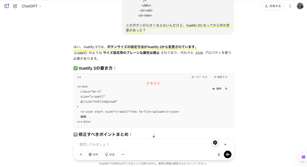 ▼ ChatGPTに、Vuetify2からVuetify3の変更内容を聞いてみたところ。